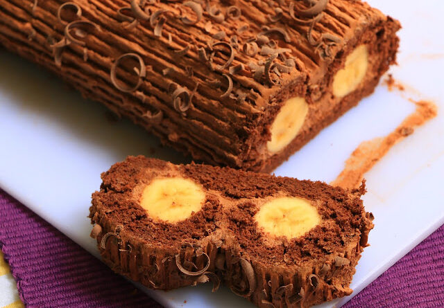 Banane ogulite i izrežite vrhove, pa dve stavite na jedan kraj fila tj. piškote a druge dve na drugi kraj. Umotajte strane prema sredini. Dobro pritisnite da se rolat zalepi, premažite ostatkom fila i stavite u frižider da se stegne. Zatim išarajte viljuškom, pospite rendanom čokoladom ili po želji. Secite šnite i uživajte u odličnom ukusu. Prijatno!