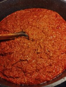 U velikom loncu zagrijem ulje, dodam samljevenu masu i na tihoj vatri kuham uz stalno miješanje. Ovaj dio traje oko 2–3 sata, sve dok se ajvar ne zgusne i ne dobije onaj prepoznatljivi miris. -