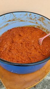 Kuhaj uz stalno miješanje oko 1–1,5 sat, dok ajvar ne postane gust i sjajan.