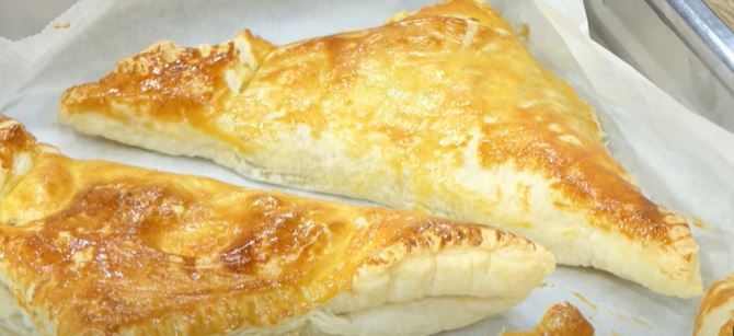 Narežite lisnato tijesto na kvadrate. Na jedan kraj staviti nadjev i saviti u trougao.