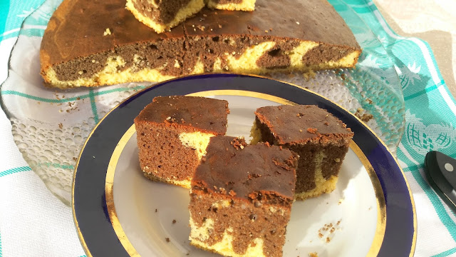 U tepsiju stavite peh papir pa sipate pola testa. U drugu polovinu dodate kakao i lepo izmešate i sipate na belu masu šarajući po tepsiji. Malo prodrmate. Pečete na 200 stepeni C oko 30 min. osetićete miris kolača koji se širi celom kućom. Pečen kolač izvadite na tacnu ohladite i sladite se.