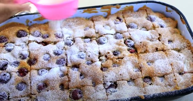 Sve sastojke sjediniti izliti u pleh 25/35cm. Peći u zagrejanoj rerni na 200c/25min. Kad se prohladi posipajte šećerom u prahu, glazurom od čokolade ili jednostavno premažite džemom i posipajte mlevenim orasima.