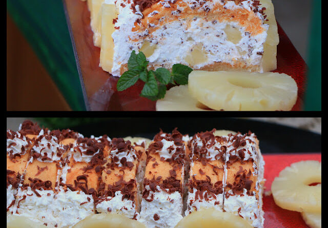 Kalup obložite folijom, iseckajte ananas, izrendajte 50 gr. čokolade. Umutite slatku pavlaku, ne morate odmah čvrsto jer će se još mutiti sa ostalim sastojcima. Dodajte pavlaku i šećer.