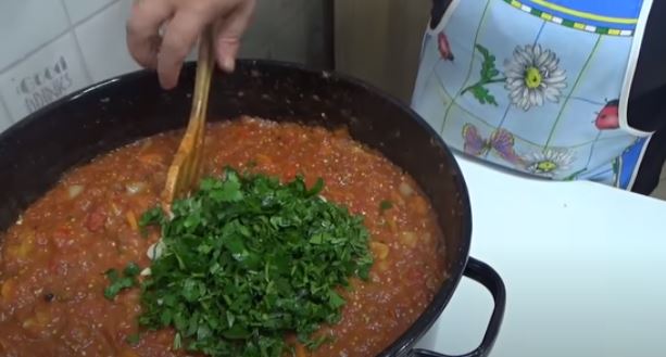2 kg. plavi patlidžan ispečen i 1,5 kg. crveni paradajz ispečen na 200c/25min.