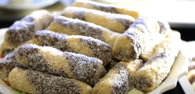 Ostaviti da se smjesa ohladi (da ne stvrdne), bijeli dio razvući na papir za pečenje pomoću oklagije, tamni dio razvući na drugi papir za pečenje pa preklopiti tijesto jedno preko drugog. Prekrižite oklagijom da spojite dijelove. Izrežite trake širine oko 1 cm. rolati i uvijati da napravite šare (možete pogledati u videu). Narežite na manje komade i uvaljajte u kokos. Ostavite kolačiće u frižider da se stegnu.