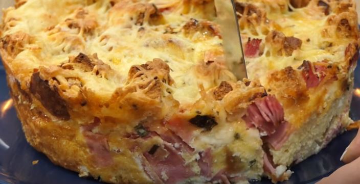 Hleb isecite na kockice, pa stavite u okruglu vatrostalnu posudu, koju ste premazali istopljenim puterom. Dodajte secakni mladi luk i šunku, a zatim i izgnječen feta sir. Prelijte otopljenim puterom. Umutite jaja sa mlekom i dobijenu smesu sipajte u posudu. Pecite u zagrejanoj rerni na 200°C oko 25 minuta. Zatim pospite rendanim sirom i origanom. Pecite 10 minuta na istoj temperaturi.