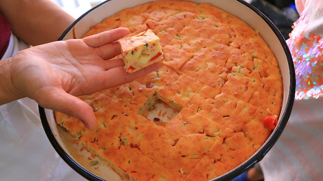 Umutite 5 jaja i dodajte sve ostale sastojke osim susama. Dobro izmesajte da ne bude grudvica pa umešajte iseckan sir, salamu, krastavce i papriku. Stavite susam ako zelite. Odmah stavite u vruću rernu i pecite oko 35 minuta. Proverite čačkalicom. Isecite kada se malo prohladi da bi kocke imale ravne ivice. Ako volite vruću možete je i odmah seci.
