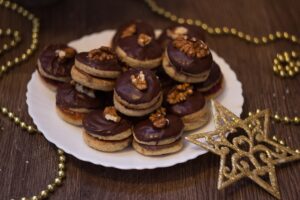 Razmesite i oklagijom istanjite testo npa čašicom vadite oblike. Pecite u zagrejanoj rerni na 180 C deset minuta. Kada se ohlade mažite kremom ili džemom, spojite ih i umačite u otopljenu čokoladu. Možete ih ukrasiti orahom.