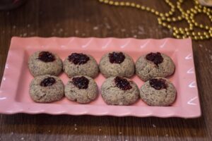 U ovaj deo testa ćemo dodati mlevenimak i izmesiti kako bi se jednako rasporedio po testu. Napravite valjak,isecit ga a zatim pravite manje loptice.Stavite u pleh obložen papirom za pečenje pa varjaču utisnite u lopticu kako bi dobili udubljenje u koje ćemo nakon pečenja dodati džem ili krem. Pecite u već zagrejanoj rerni na 180 C deset minuta.