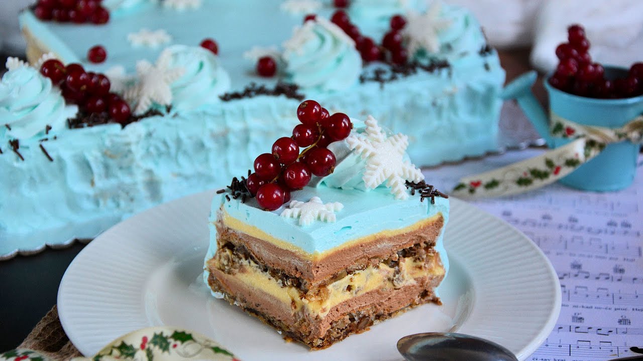 U sud sipajte hladno mleko (250 ml) pa dodajte šlag penu iz kesica i malo plave boje. Mikserom umutite i čvrst šlag. Premažite tortu sa svih strana i ukrasite. Po ivicama pospite kakao mrvice i dodatno dekorišite fondan pahuljama i ribizlama. Ostavite da se ohladi pa isecite na željenu parčad.