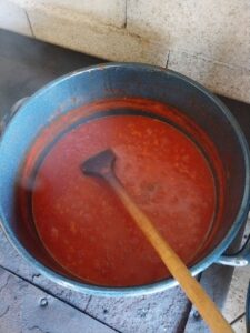 Pasirani sos vratim u lonac, dodam šećer, so, biber, mljevenu papriku i karanfilić. Kuham na tihoj vatri 1–1,5 sat, povremeno miješajući, dok se ne zgusne. -