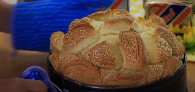 Spremnu pogaču premažite preostalim margarinom, pospite susamom, prekrite krpom pa ostavite da stoji oko 20 – 30 minuta.