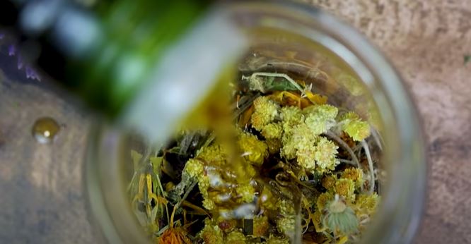 Bilje po izboru (dodala sam po 1 kašiku nevena, kantariona, smilja, koprive, hibiskusa) u videu imate i latinske nazive ovih biljaka dodala sam i kašičicu karanfilića i 1 vrećicu zelenog čaja, i na kraju nekoliko kapi eteričnog ulja lavande. Sve sam prelila maslinovim uljem.