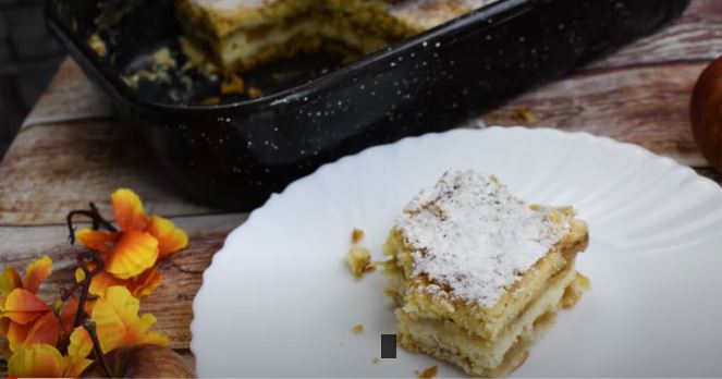 Pouring apple pie is a real little miracle of a cake. There is no whipping, no eggs or milk, and