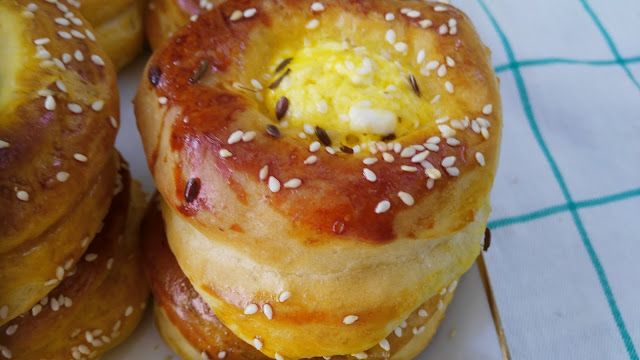 Namazati žumancetom i posuti susamom. Narasle margarite, peći na 180 stepeni C oko 25 min. Služiti tople. Izvaredno pecivo za doručak..