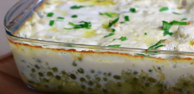 Grašak sipajte u posudu za pečenje, preko stavite meso i prelijte sosom. Pecite pokriveno u prethodno zagrejanoj rerni na 220 stepeni oko 30-35 minuta. Prijatno!