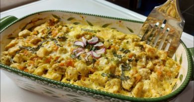 Kad poređate naizmenično sve sastojke kao na video receptu i nalijete prelivom ostavite da odstoji 30min. a onda pečite u zagrejanoj rerni na 180c/30min.Dok lepo ne porumeni.