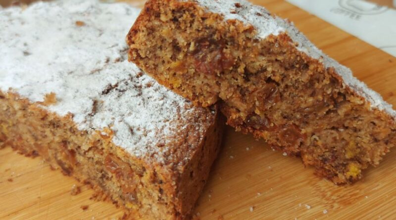 Priprema: Umutiti jaja sa šećerom, dodati brašno sa grizom i praškom za pecivo, mleveni keks, jabuke, suvo grožđe, ulje, mleko i sve izjednačiti. Pleh obložiti pek papirom, sipati smesu i poravnati. Peći na 200 stepeni 30-40 min zavisnosti od rerne. Odozgo može glazura čokolade ili prah šećer zamirisan vanilom.