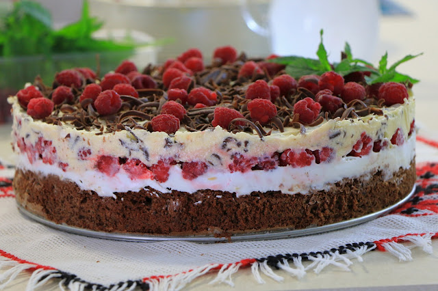 Vruću koru izbockajte čačkalicom pa premažite toplim belim filom, ostavite da se stegne i ohladi. Zatim poređajte maline, premažite žuti fil i tortu ukrasite po želji, šlagom, rendanom ili topljenom čokoladom…Ostavite da se dobro stegne, najbolje do sutradan pa uživati u njoj. Prijatno.