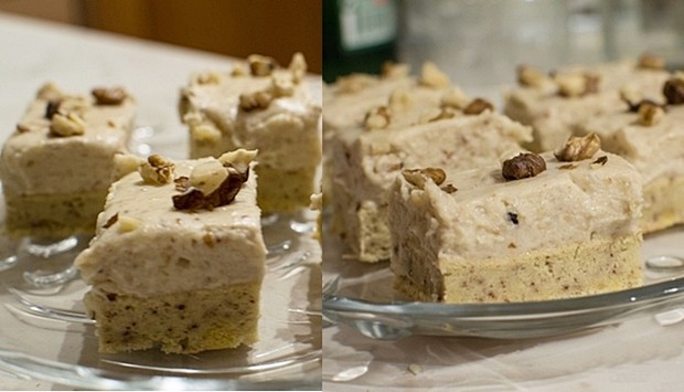 Kremu mazati preko ohlađenoga biskvita. Posuti sjeckanim orasima.