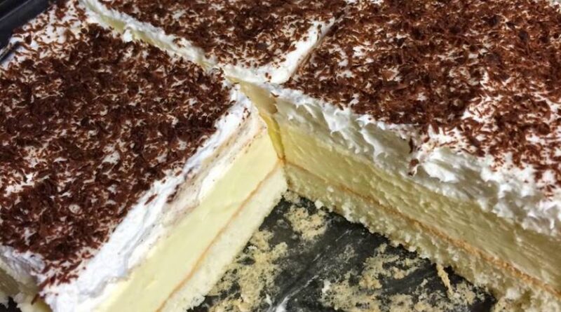 Priprema Biskvit: Izmiješati 7 bjelanjaka i postepeno nadodavati šećer, pa brašno i vodu. Biskvit staviti u nauljenu tepsiju i peći na 160°C dok biskvit ne porumeni (oko 25 min). Izvaditi biskvit čim dobije boju jer će u protivnom biti pretvrd. Ostaviti biskvit da se ohladi. Kada je biskvit ohlađen treba ga nabosti čačkalicom i preliti s 1 dl mlijeka i malo ruma. Krema: dobro izmiješati žumanjke, brašno, šećer, gustin i 1 dl mlijeka. Navedenu smjesu dodati u 7 dl vrućeg mlijeka i kuhati (kao puding) 5 minuta. Ostaviti kremu da se ohladi. Kada je krema hladna u nju dodati 1 margarin i dobro izmiješati. Gotovu kremu premazati po biskvitu. Pripremiti šlag po uputama na kesici i premazati kolač. Nakon toga sitno nasjeckati čokoladu i posuti po kolaču.