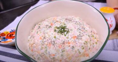 Najpre piletinu skuvajte u vodi i začinite je suvim začinom ili kockom za supu kako bi bila ukusnija. Naseckajte sitno sve sastojke, promešajte a zatim ostavite u frižider da se salata lepo ohladi pa servirajte na tanjir i uživajte u divnom ukusu. Prijatno!