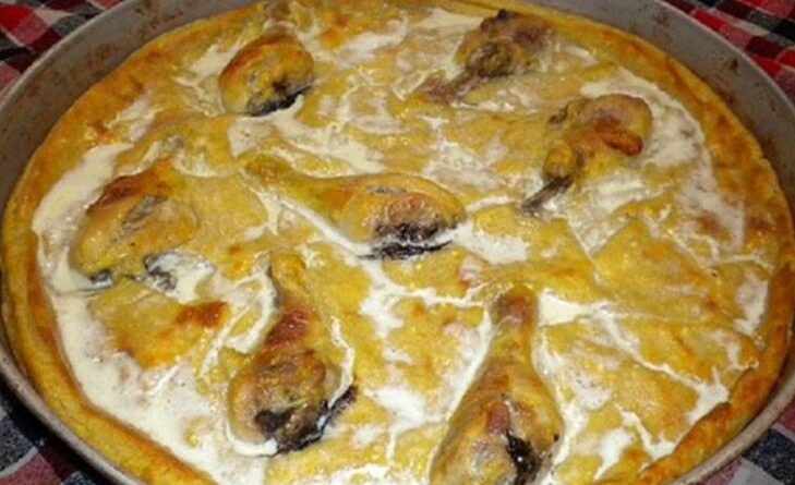 Na toplo ulje izlijte trećinu pripremljene smjese od jaja i brašna. Na to rasporedite popečeno meso, a po mesu izlijte preostalu smjesu od jaja, brašna i mlijeka. Pecite u pećnici zagrijanoj na 210°C, 20-30 minuta. pečenu kvrgušu malo ohladite, narežite, poslužite uz salatu.