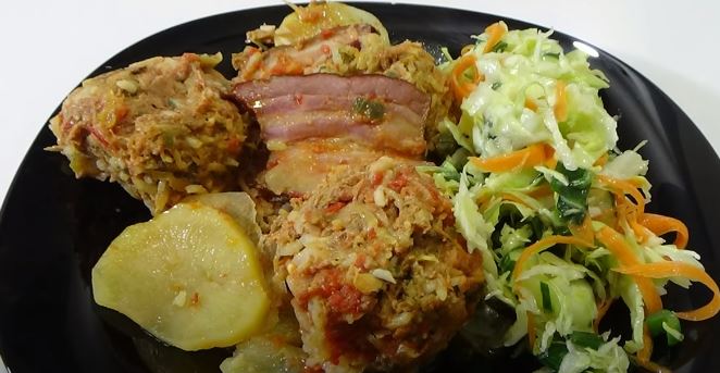 Na prodinstano povrće dodati kolutove paradajza a preko toga poređajte lažne sarme u obliku većih ćufti.Između njih ređajte kolutove krompira i tanke parčiće slanine.