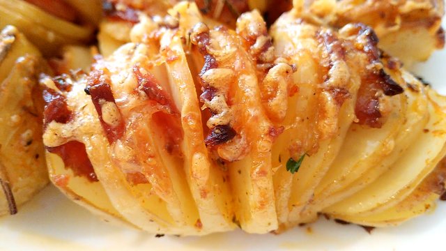 Probosti malo niže ne na sredinu , zatim nožem zaseći listiće po krompiru sve do kraja dok nož ne udari u štapić. U činiju sipati malo ulja dodati sve začine i uvaljati krompir, a zatim izmedju svakog proreza ubaciti po malo suve slanine.Kad sve napunite poredjajte u pleh u koji ste stavili pek papir i pospite krompir parmezanom.