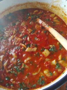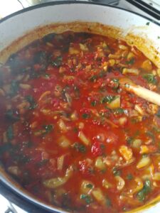 4. U dubljoj šerpi ugrijem ulje, dodam smjesu paprika, paradajza i ljutih papričica, te kuham na laganoj vatri oko 40 minuta uz povremeno miješanje.
