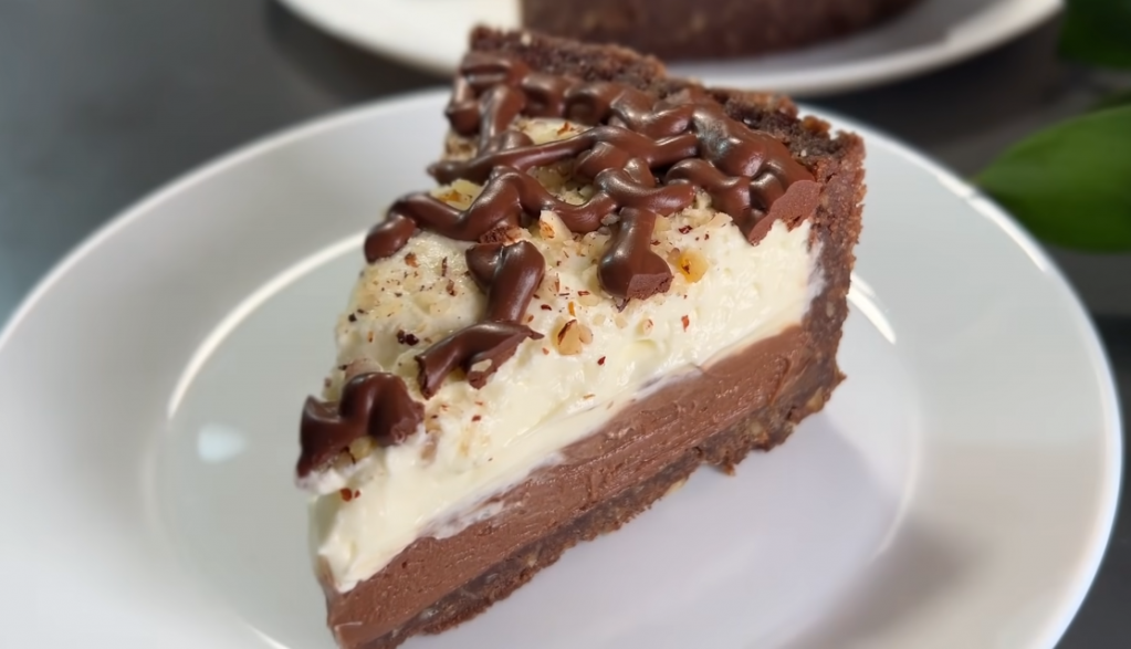 U drugoj posudi mikserom umutite 200 grama krem sira sa 200 grama krema i to sipajte u kalup, preko već pripremljene kore i poravnajte.