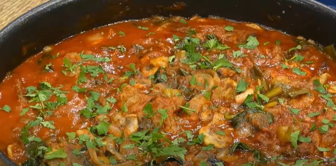 Dodajte meso i paradajz iz konzerve, začinite ruzmarinom i poklopite poklopcem. Ostavite 15 minuta na laganoj vatri (3. stepen). Kada je jelo gotovo pospite peršunom.