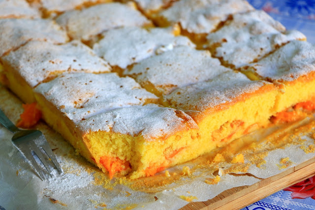 Umutiti penasto jaja sa šećerom, dodati slatku pavlaku, aromu, promešati. Umešati i prosejano brašno, prašak za pecivo i sve izliti u podmazan (ili pek papir) pleh, dimenzije 20 x 30. Poređati iseckane kajsije i peći u zagrejanoj rerni na 180 stepeni oko 30 – 40 minuta.