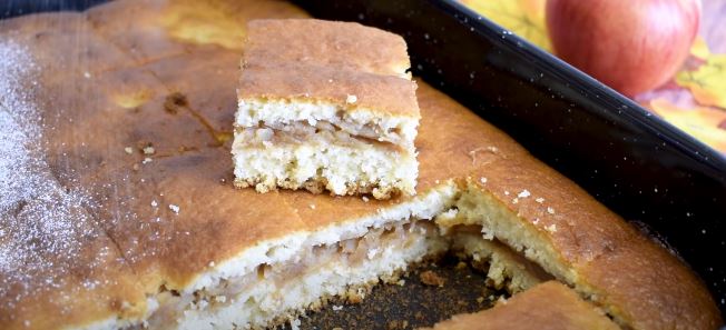 Nauljite pleh veličine 34×21 odnosno pleh srednje veličine. Pospite ga sa malo brašna i protresite. Sipajte najpre polovinu smese i ubacite u već zagrejanu rernu pa pecite desetak minuta na 180 C. Nakon toga izvadite koru pa na nju sipajte izdinstane jabuke koje su se prohladile. Jabuke izravnajte špatulom pa preko njih izlijte drugu polovinu fila. Poravnajte sve špatulom i vratite u rernu pa pecite dok pita lepo ne porumeni. Mislim da će biti dovoljno još dvadesetak minuta, maksimalno pola sata.