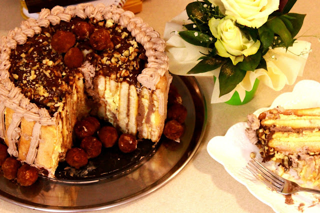 Završen obruč, iznutra premazati tankim slojem tamnog fila, pa ponoviti postupak..tako radimo sve do kraja. Piškote obavezno umočite u sok da budu mekše.