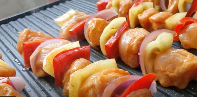 Na krupnije kockice sjeći pileća prsa te pripremiti marinadu : 100 ml jogurta, 50 ml maslinovog ulja. Staviti malo soli, bibera i 2 kašikice crvena paprike. Sve dobro izmiješati i dodati piletinu koju možemo još malo posoliti i opet dobro promiješati. Meso ostaviti u frižider do upotrebe, može i preko noći slobodno