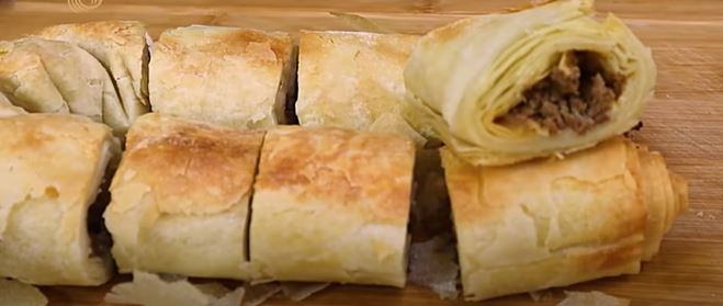 Pita sa mesom od gotovih kora (burek). Recept za brzi burek, potkovica, sa mesom. Lisnato testo od gotovih kora.