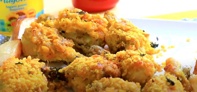 Svaki komad mesa bogato premažite umućenom masom i uvaljajte u kornfleks, složite na tepsiju i na kraju prelijte maslinovim uljem.