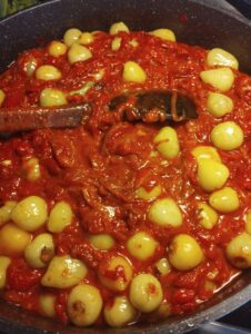 Na ulju proprži sitno sjeckan luk dok ne postane staklast. Dodaj paradajz i dinstaj dok se ne zgusne i postane sosast. Posoli, dodaj šećer, biber i lovor. -