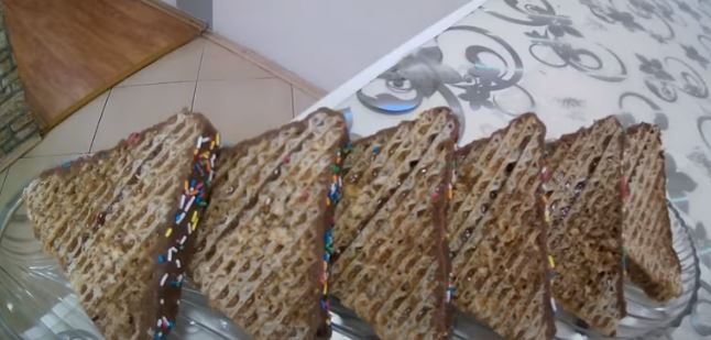 Oblandu izrezati na kaiševe porečno.Od jednog lista 4 kaiša.Dobićete 20 kaiša.Podelite na pola i po 10 kaiša premazujte filom.