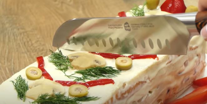 Zatim izvadite gotovo predjelo iz kalupa za tortu i nanesite tanak sloj majoneze na vrh i na stranice. Dekoriramo po izboru.