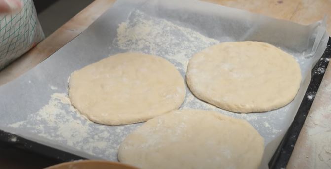 Sada vrhovima prstiju, koje umačemo u brašno širimo testo da dobije oblik lepinje.