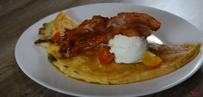 Potrebno: 2 jajeta, 2 cena belog luka, suvi biljni zacin, sampinjoni, gauda, slanina.