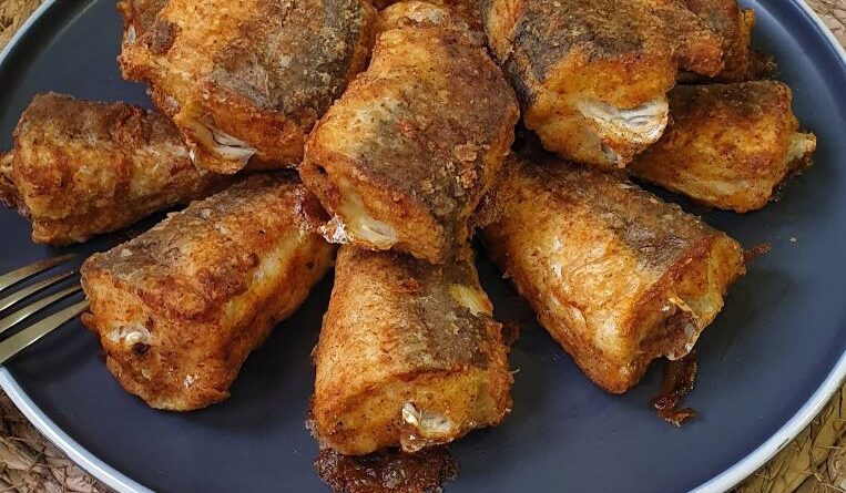 Svaki komad ribe uvaljati u mešavinu brašna sa začinima, pa ređati na nauljen pleh.