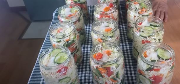 Povrce iseckati, zatim redjati u sterilisane tegle. I svaku teglu dodati po jednu kašičicu soli, zatim po jednu kašičicu kristal šećera, nakon toga po dve supene kašike sirćeta. Naliti tegle vrelom vodom do kraja. Izvršiti pasterizaciju.