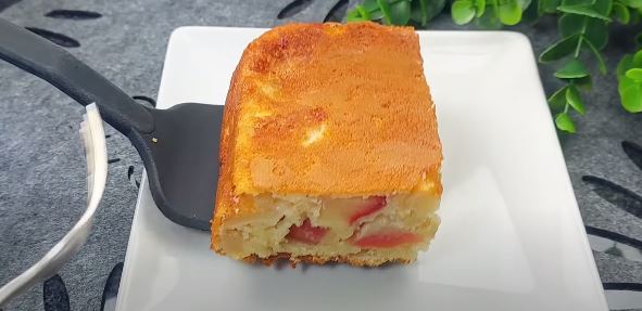 Umutite jaja sa prstohvatom soli i šećerom, pa dodajte mleko i istopljeni puter. Promešajte, a onda dodajte cimet,vanilu i rendanu koru limuna. Opet promešajte, pa dodajte prosejano brašno sa praškom za pecivo.
