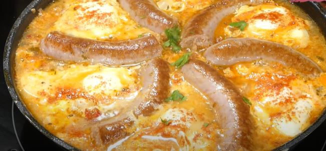 Kada voda iz paradajza ispari, nakon otprilike 7-8 minuta rasporedite kobasicu narezanu na komade, a između komada kobasice razbijte 1 jaje. Svako jaje posolite i pospite paprikom.