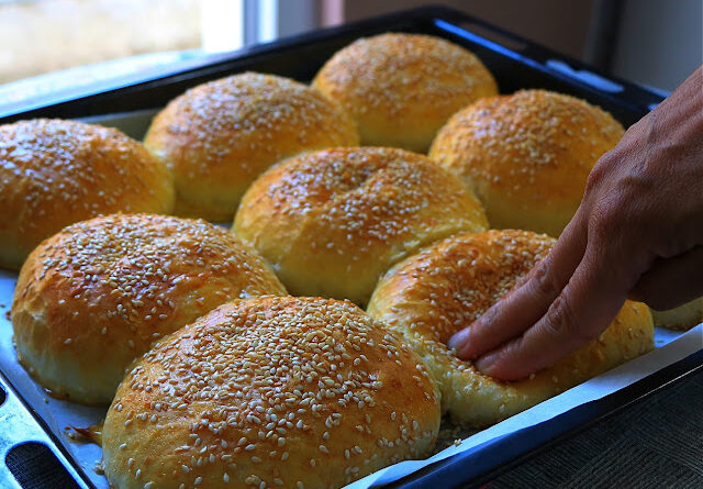Izmešajte jaje sa maslacem, dodajte vodu i nadošli kvasac. Zamesite testo, dobro ga izradite i ostavite 30 minuta. Podelite na manje jednake delove i napravite loptice. Ređajte na podmazanu tepsiju, prekrijte folijom ili kesom za zamrzivač, krpom i ostavite da stoje sat vremena. Premažite umućenim jajetom i mlekom, pospite susamom i pecite oko 20 minuta na 200 stepeni. Ja stavim na dno rerne manju tepsiju ili posudu sa vodom da isparava dok se pogačice peku.