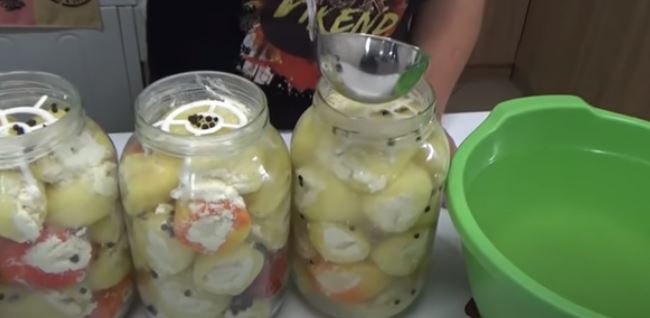 Paprike sačekati da se prohlade napuniti sirom i režati u tegle dodajući biber u zrno.Porežane paprike zaliti vodom u kojoj su se paprike barile.Zatvorite tegle i staviti da se pasterizuju u vodi.Vreme pasterizacije od ključanja 15min.pa ostaviti do sutradan da se ohladi u vodi.