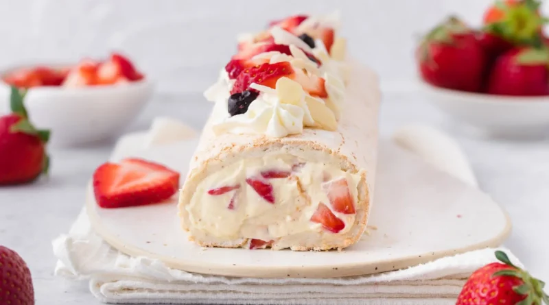 Pažljivo sve zarolajte u roladu pomoću papira za pečenje ili krpe. Ovako pripremljenu roladu stavite u hladnjak na nekoliko sati kako bi se dobro stisnula. Ohlađenu ukrasite preostalom kremom, jagodama i listićima badema i kokosa.